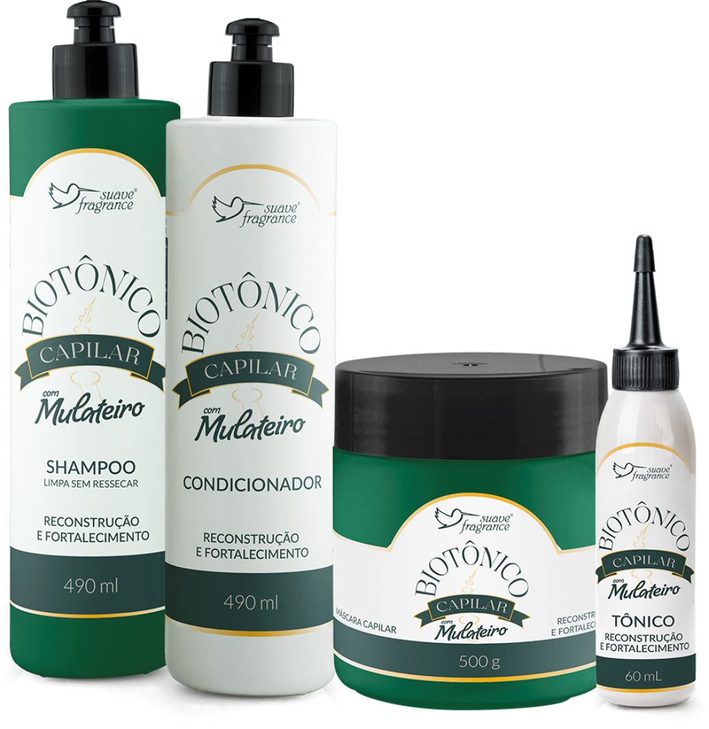 A Suave Fragrance criou a linha Biotônico Capilar com extrato do Mulateiro, composta por shampoo, máscara capilar, condicionador e tônico. Ela possui ativos que auxiliam no tratamento dos fios, fortalecendo e reconstruindo a fibra capilar. São eles: